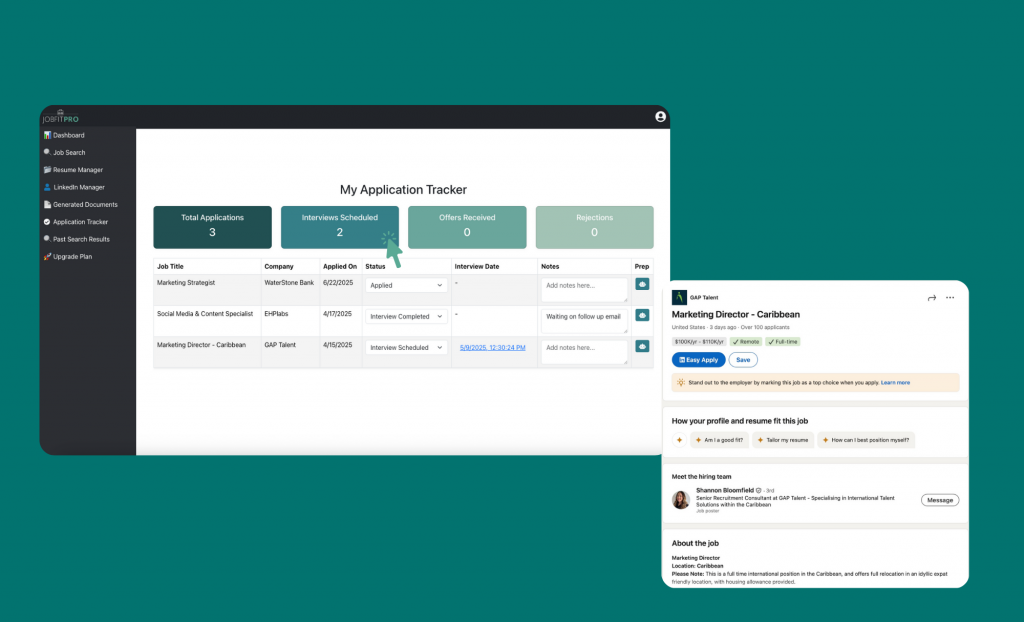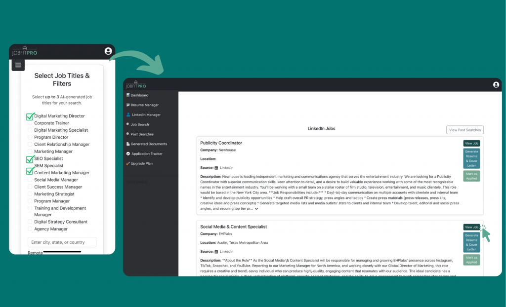JobFitPro is an AI-powered platform that helps you generate resumes, cover letters, search jobs, and track applications—all in one place.