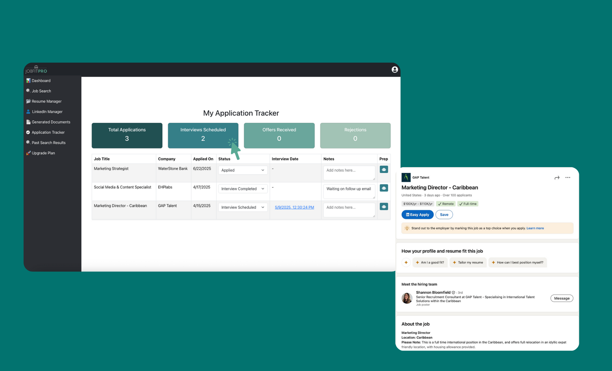Track your applications, resumes, and cover letters—stay organized, efficient, and in control.